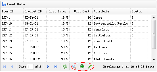 <table id="tt" title="Load Data" class="easyui-datagrid" style="width:550px;height:250px" url="data/datagrid_data.json" iconCls="icon-save" pagination="true"> <thead> <tr> <th field="itemid" width="80">Item ID</th> <th field="productid" width="80">Product ID</th> <th field="listprice" width="80" align="right">List Price</th> <th field="unitcost" width="80" align="right">Unit Cost</th> <th field="attr1" width="100">Attribute</th> <th field="status" width="60" align="center">Stauts</th> </tr> </thead> </table>