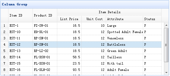 <table id="tt" title="Column Group" class="easyui-datagrid" style="width:550px;height:250px" url="data/datagrid_data.json" singleSelect="true" iconCls="icon-save" rownumbers="true"> <thead> <tr> <th rowspan="2" field="itemid" width="80">Item ID</th> <th rowspan="2" field="productid" width="80">Product ID</th> <th colspan="4">Item Details</th> </tr> <tr> <th field="listprice" width="80" align="right">List Price</th> <th field="unitcost" width="80" align="right">Unit Cost</th> <th field="attr1" width="100">Attribute</th> <th field="status" width="60" align="center">Stauts</th> </tr> </thead> </table>