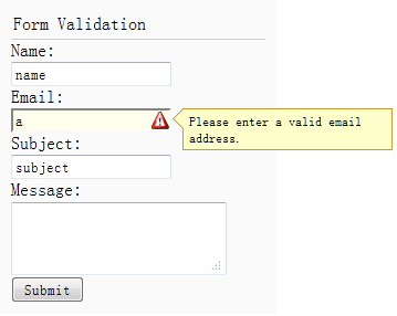 <div style="padding:3px 2px;border-bottom:1px solid #ccc">Form Validation</div> <form id="ff" method="post"> <div> <label for="name">Name:</label> <input class="easyui-validatebox" type="text" name="name" required="true"></input> </div> <div> <label for="email">Email:</label> <input class="easyui-validatebox" type="text" name="email" required="true" validType="email"></input> </div> <div> <label for="subject">Subject:</label> <input class="easyui-validatebox" type="text" name="subject" required="true"></input> </div> <div> <label for="message">Message:</label> <textarea name="message" style="height:60px;"></textarea> </div> <div> <input type="submit" value="Submit"> </div> </form>