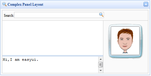 <div class="easyui-panel" title="Complex Panel Layout" iconCls="icon-search" collapsible="true" style="padding:5px;width:500px;height:250px;"> <div class="easyui-layout" fit="true"> <div region="north" border="false" class="p-search"> <label>Search:</label><input></input> </div> <div region="center" border="false"> <div class="easyui-layout" fit="true"> <div region="east" border="false" class="p-right"> <img src="images/msn.gif"/> </div> <div region="center" border="false" style="border:1px solid #ccc;"> <div class="easyui-layout" fit="true"> <div region="south" split="true" border="false" style="height:60px;"> <textarea style="border:0;width:100%;height:100%;resize:none">Hi,I am easyui.</textarea> </div> <div region="center" border="false"> </div> </div> </div> </div> </div> </div> </div>