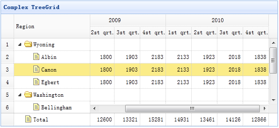 <table title="Complex TreeGrid" class="easyui-treegrid" style="width:550px;height:250px" url="data/treegrid2_data.json" rownumbers="true" showFooter="true" idField="id" treeField="region"> <thead frozen="true"> <tr> <th field="region" width="150">Region</th> </tr> </thead> <thead> <tr> <th colspan="4">2009</th> <th colspan="4">2010</th> </tr> <tr> <th field="f1" width="50" align="right">1st qrt.</th> <th field="f2" width="50" align="right">2st qrt.</th> <th field="f3" width="50" align="right">3st qrt.</th> <th field="f4" width="50" align="right">4st qrt.</th> <th field="f5" width="50" align="right">1st qrt.</th> <th field="f6" width="50" align="right">2st qrt.</th> <th field="f7" width="50" align="right">3st qrt.</th> <th field="f8" width="50" align="right">4st qrt.</th> </tr> </thead> </table>