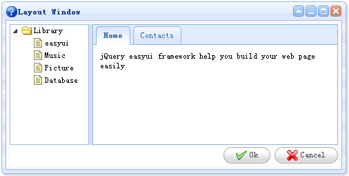 <div class="easyui-window" title="Layout Window" icon="icon-help" style="width:500px;height:250px;padding:5px;background: #fafafa;"> <div class="easyui-layout" fit="true"> <div region="west" split="true" style="width:120px;"> <ul class="easyui-tree"> <li> <span>Library</span> <ul> <li><span>easyui</span></li> <li><span>Music</span></li> <li><span>Picture</span></li> <li><span>Database</span></li> </ul> </li> </ul> </div> <div region="center" border="false" border="false"> <div class="easyui-tabs" fit="true"> <div title="Home" style="padding:10px;"> jQuery easyui framework help you build your web page easily. </div> <div title="Contacts"> No contact data. </div> </div> </div> <div region="south" border="false" style="text-align:right;height:30px;line-height:30px;"> <a class="easyui-linkbutton" icon="icon-ok" href="javascript:void(0)">Ok</a> <a class="easyui-linkbutton" icon="icon-cancel" href="javascript:void(0)">Cancel</a> </div> </div> </div>