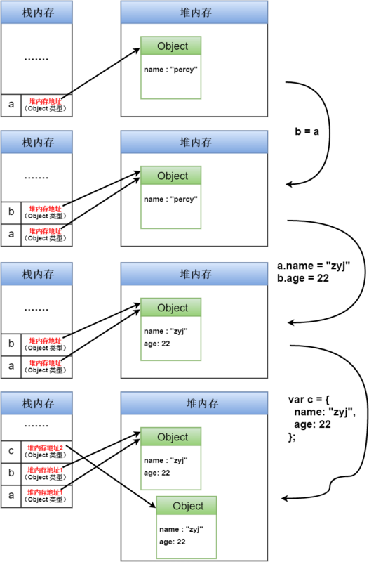 var a = {name:"percy"}; var b; b = a; a.name = "zyj"; console.log(b.name); // zyj b.age = 22; console.log(a.age); // 22 var c = { name: "zyj", age: 22 };图解如下:
