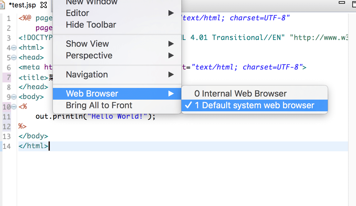 在WebContent文件夹下新建一个test.jsp文件。在下图中可以看到它的默认代码: