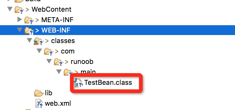 编译完成后会在当前目录下生成一个 TestBean.class 文件, 将该文件拷贝至当前 JSP 项目的 WebContent/WEB-INF/classes/com/runoob/main 下( com/runoob/main 包路径,没有需要手动创建)。