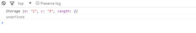 var storage=window.localStorage; storage.a=1; storage.setItem("c",3); console.log(storage); storage.removeItem("a"); console.log(storage.a);控制台查看结果: