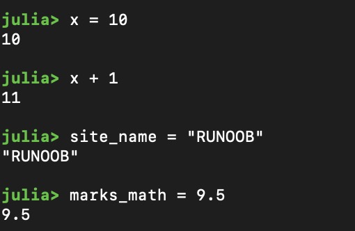 Julia 变量使用很简单,只需赋值即可,如下实例: