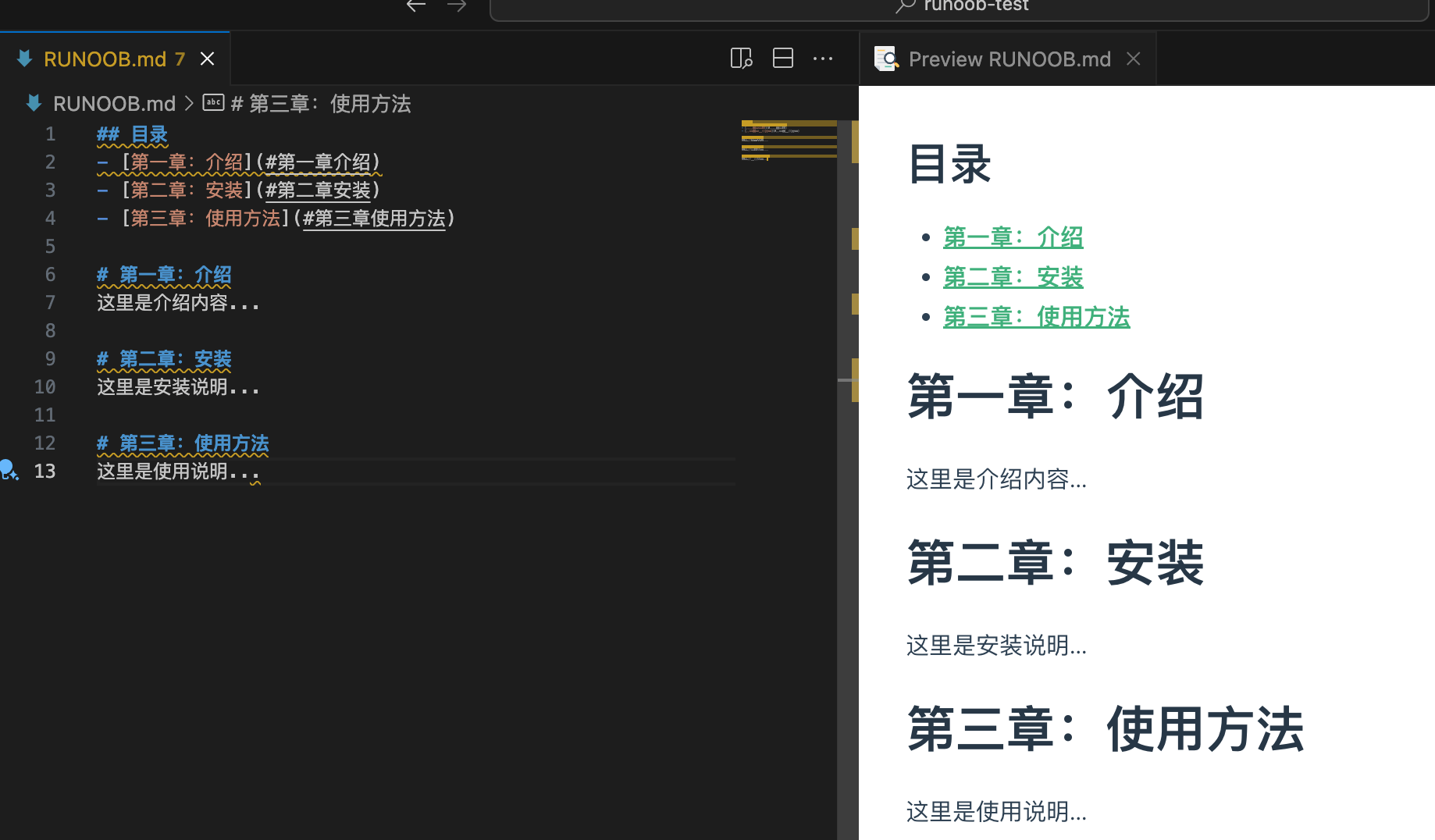 ## 目录 - [第一章:介绍](#第一章介绍) - [第二章:安装](#第二章安装) - [第三章:使用方法](#第三章使用方法) # 第一章:介绍 这里是介绍内容... # 第二章:安装 这里是安装说明... # 第三章:使用方法 这里是使用说明...