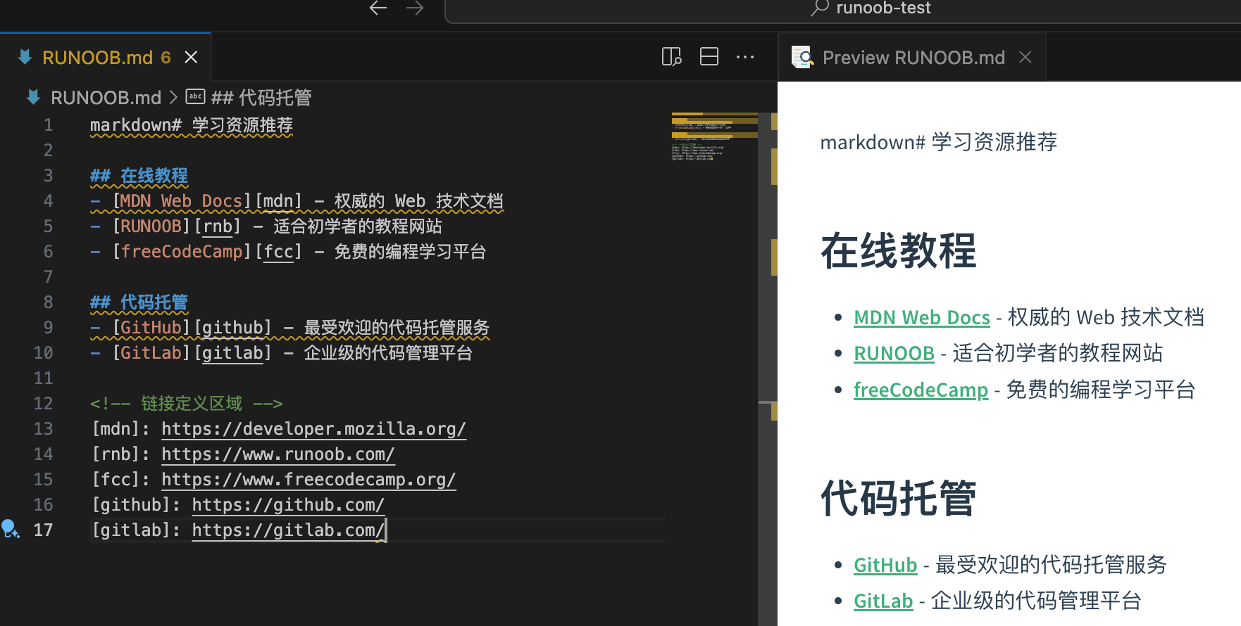 markdown# 学习资源推荐 ## 在线教程 - [MDN Web Docs][mdn] - 权威的 Web 技术文档 - [RUNOOB][rnb] - 适合初学者的教程网站 - [freeCodeCamp][fcc] - 免费的编程学习平台 ## 代码托管 - [GitHub][github] - 最受欢迎的代码托管服务 - [GitLab][gitlab] - 企业级的代码管理平台 <!-- 链接定义区域 --> [mdn]: https://developer.mozilla.org/ [rnb]: https://www.runoob.com/ [fcc]: https://www.freecodecamp.org/ [github]: https://github.com/ [gitlab]: https://gitlab.com/