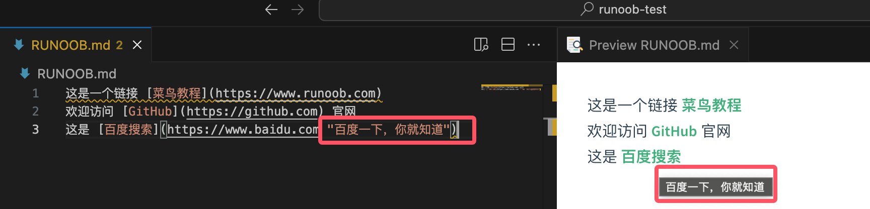 这是一个链接 [菜鸟教程](https://www.runoob.com) 欢迎访问 [GitHub](https://github.com) 官网 这是 [百度搜索](https://www.baidu.com "百度一下,你就知道")