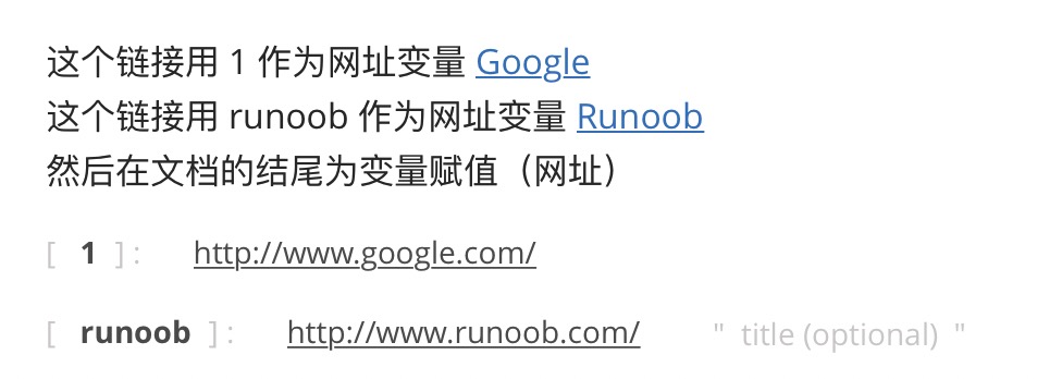 这个链接用 1 作为网址变量 [Google][1] 这个链接用 runoob 作为网址变量 [Runoob][runoob] 然后在文档的结尾为变量赋值(网址) [1]: http://www.google.com/ [runoob]: http://www.runoob.com/