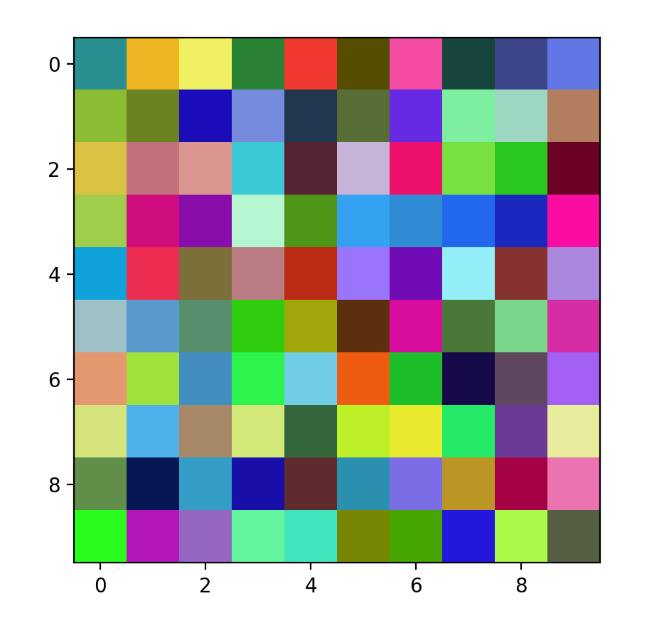 以上实例中我们生成了一个 10x10 的随机彩色图像,并使用 imshow() 函数将其显示出来。