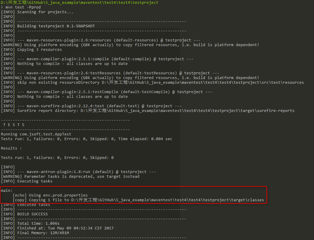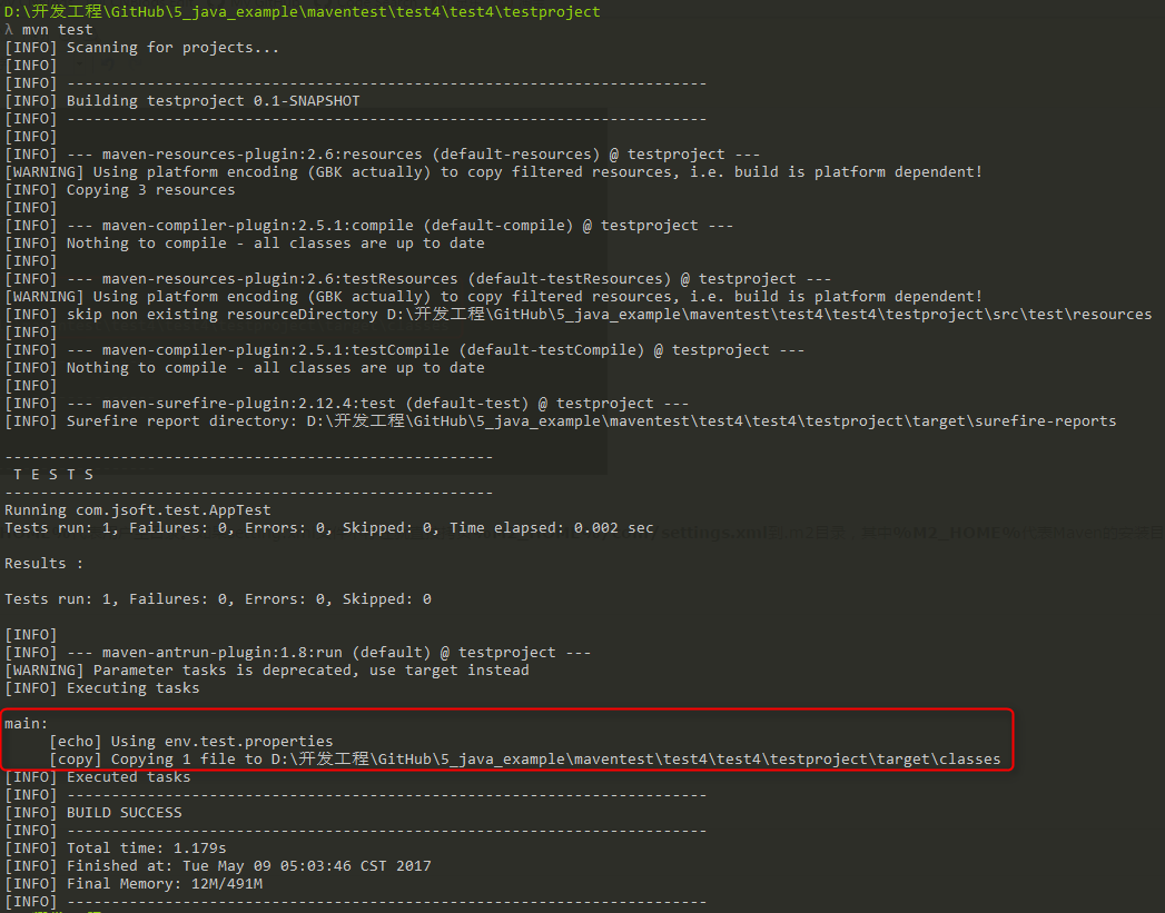 提示 1:此时不需要使用 -Ptest 来输入参数了,上面的 setting.xml 文件的 <activeprofile> 已经指定了 test 参数代替了。