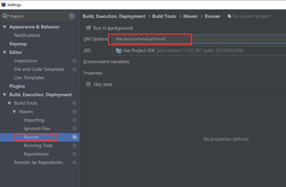 3、运行 MVN 命令的时候加上 -DarchetypeCatalog=local 这个参数。在 IDEA 中: