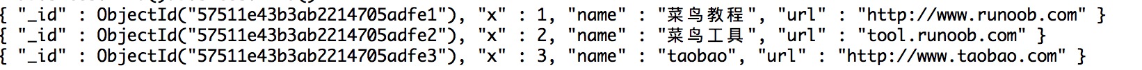 接下来我们使用 "db.sites.find()" 命令查看数据的变化,x 为 2 的数据已经变成了菜鸟工具: