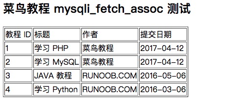 echo '<h2>菜鸟教程 mysqli_fetch_assoc 测试</h2>';