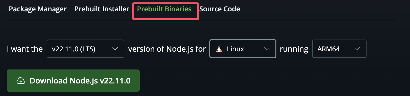# wget https://nodejs.org/dist/v22.11.0/node-v22.11.0-linux-arm64.tar.xz // 下载 # tar xf node-v22.11.0-linux-arm64.tar.xz // 解压 # cd node-v22.11.0-linux-arm64/ // 进入解压目录 # ./bin/node -v // 执行node命令 查看版本