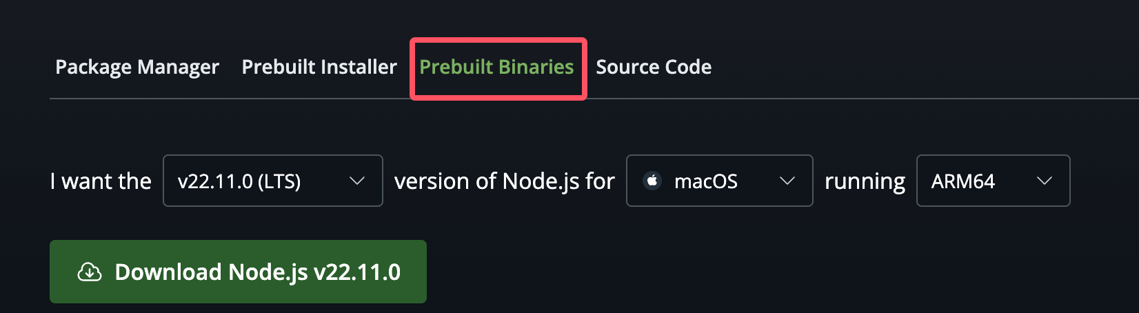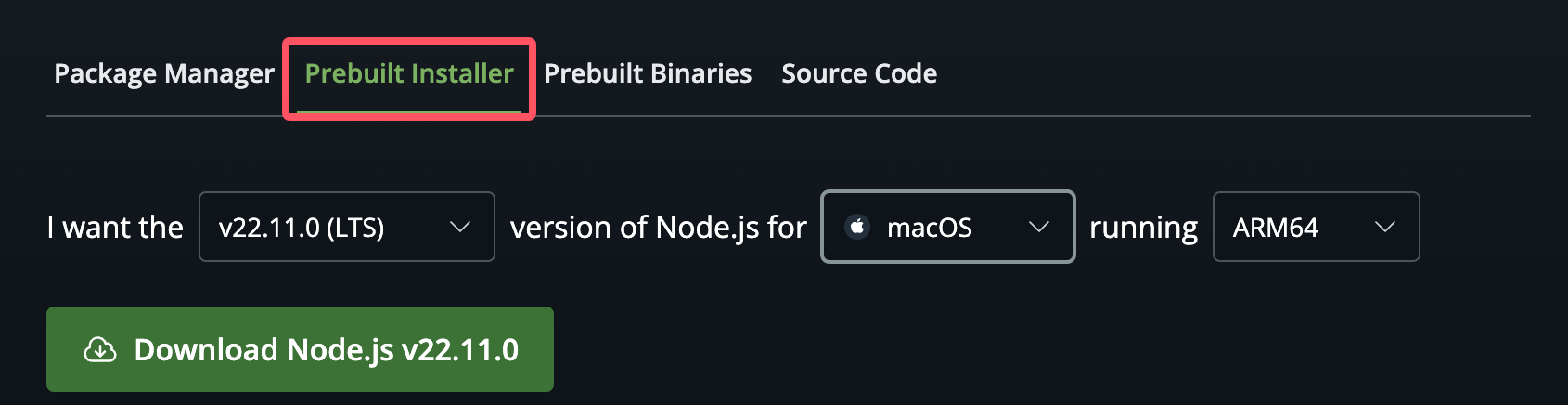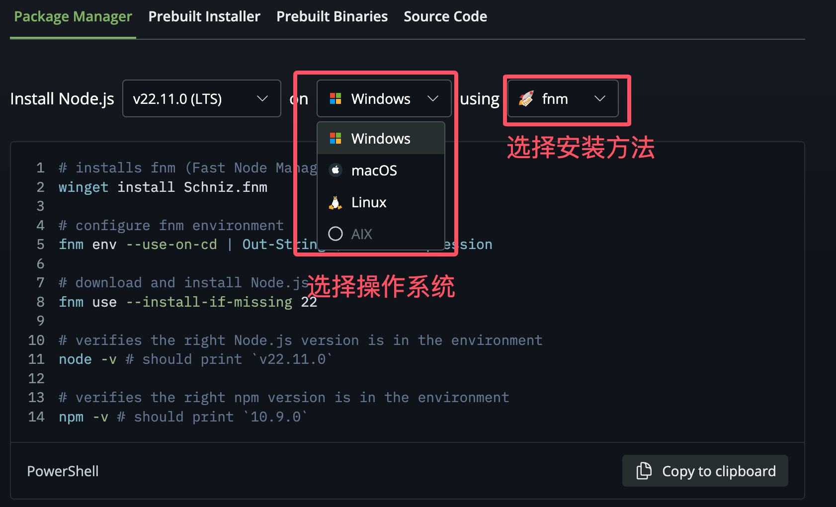 Node.js 官方针对不同系统已经给出了非常详细的安装命令,你可以根据不同平台系统选择你需要的 Node.js 安装命令脚本。