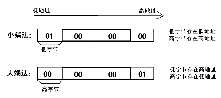 小端模式:指数据的高字节保存在内存的高地址中,而数据的低字节保存在内存的低地址中,这种存储模式将地址的高低和数据位权有效地结合起来,高地址部分权值高,低地址部分权值低。