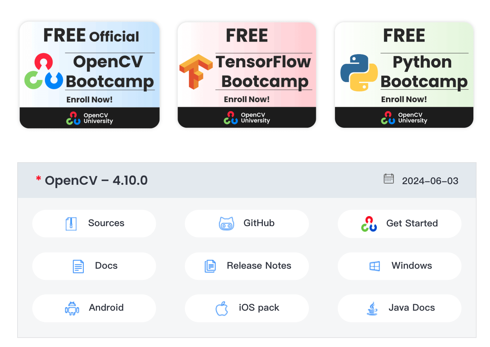 我们可以从 OpenCV 的 GitHub 仓库 下载源码,或者直接从 OpenCV 的 官方网站 下载预编译的版本。