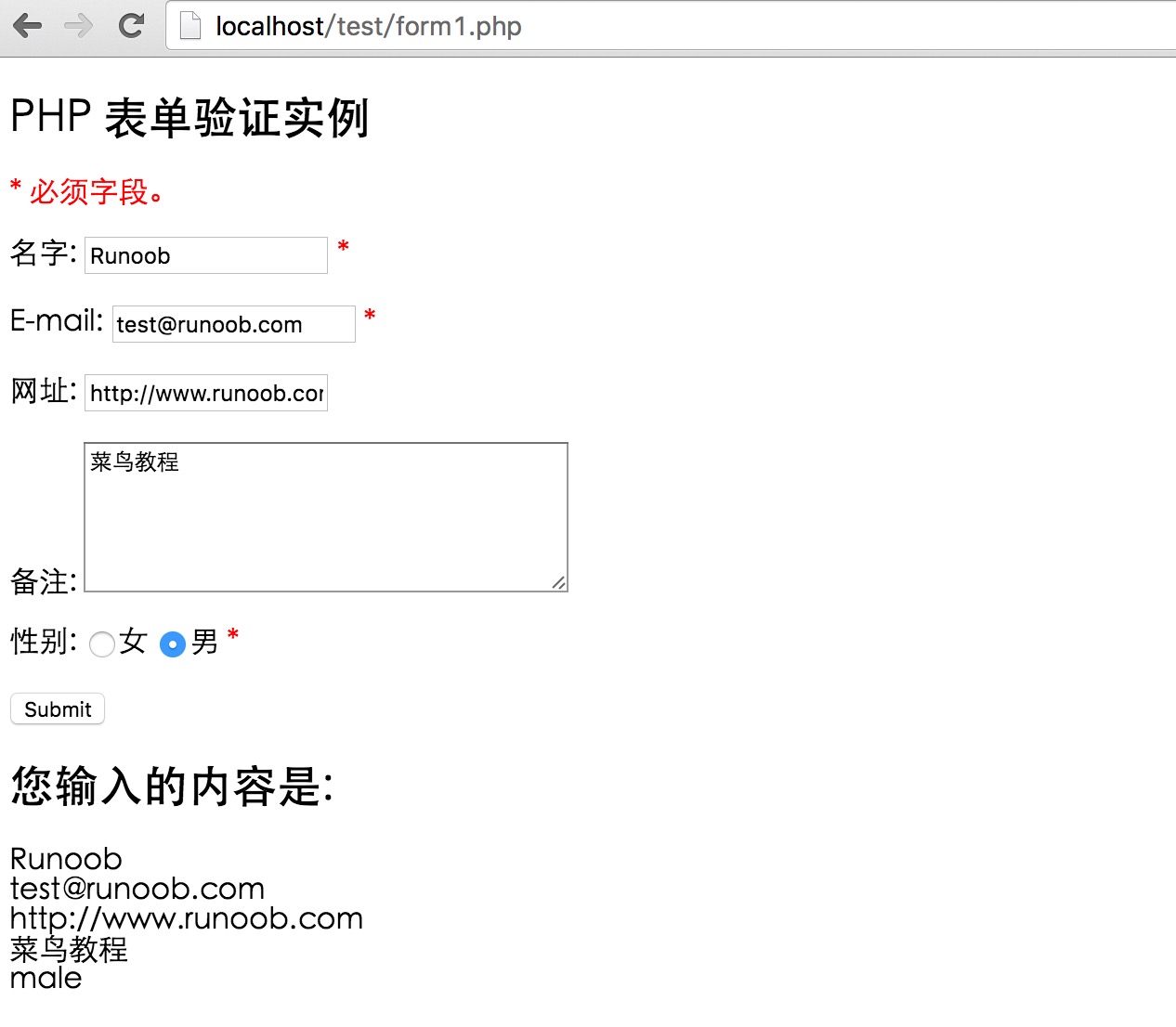 <form method="post" action="<?php echo htmlspecialchars($_SERVER["PHP_SELF"]);?>"> 名字: <input type="text" name="name" value="<?php echo $name;?>"> <span class="error">* <?php echo $nameErr;?></span> <br><br> E-mail: <input type="text" name="email" value="<?php echo $email;?>"> <span class="error">* <?php echo $emailErr;?></span> <br><br> 网址: <input type="text" name="website" value="<?php echo $website;?>"> <span class="error"><?php echo $websiteErr;?></span> <br><br> 备注: <textarea name="comment" rows="5" cols="40"><?php echo $comment;?></textarea> <br><br> 性别: <input type="radio" name="gender" <?php if (isset($gender) && $gender=="female") echo "checked";?> value="female">女 <input type="radio" name="gender" <?php if (isset($gender) && $gender=="male") echo "checked";?> value="male">男 <span class="error">* <?php echo $genderErr;?></span> <br><br> <input type="submit" name="submit" value="Submit"> </form>