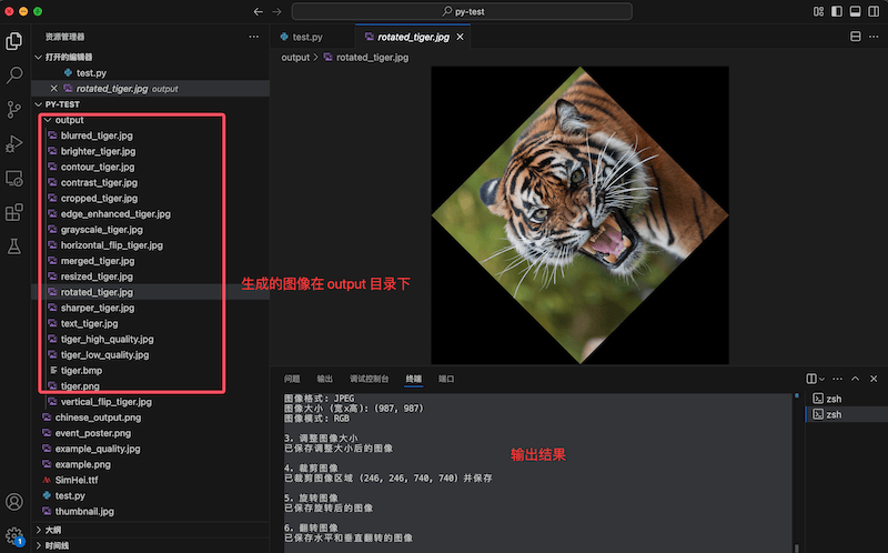 rotate()方法用于旋转图像,第一个参数是旋转角度(逆时针,以度为单位)expand=True参数会扩展输出图像的尺寸,以容纳整个旋转后的图像- 如果不设置
