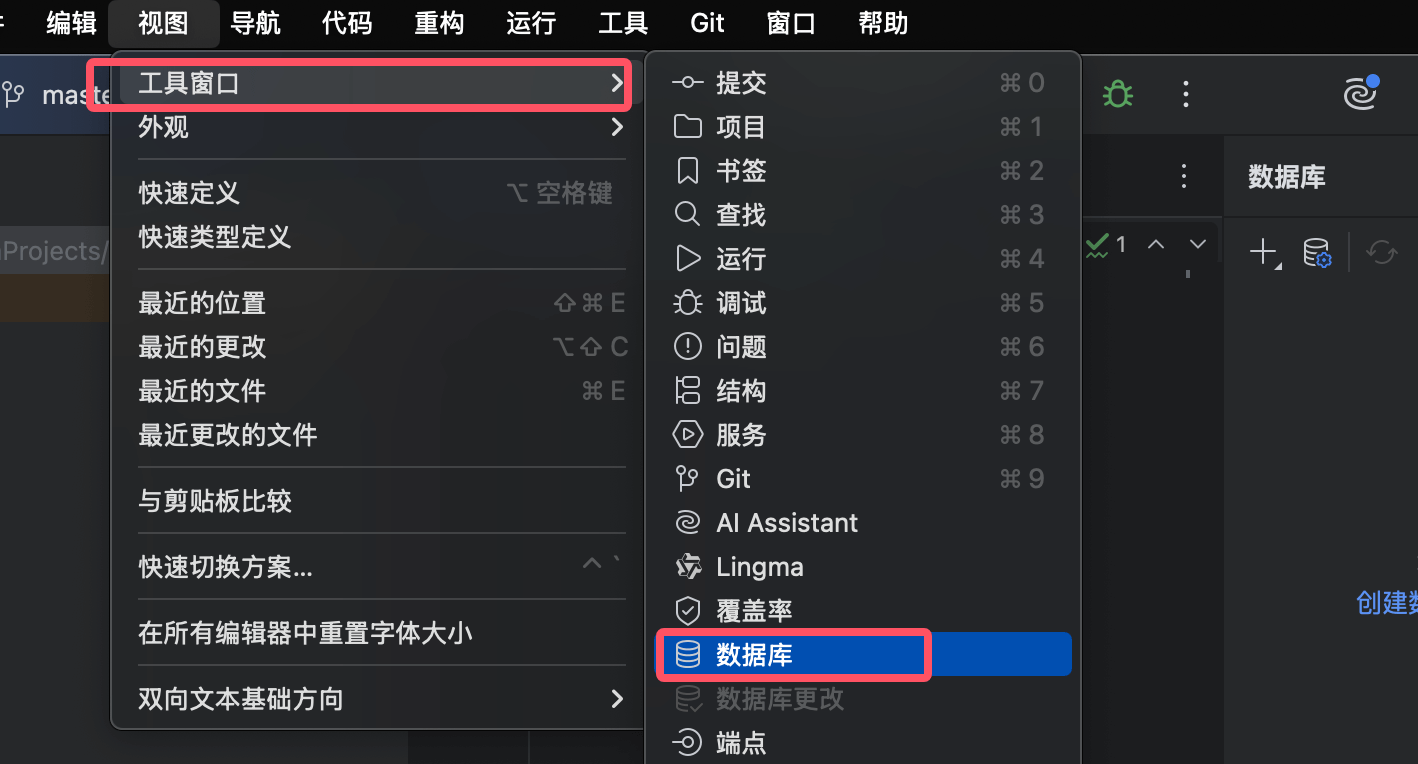 或者通过菜单栏 视图(View) → 工具窗口(Tool Windows) → 数据库(Database) 打开数据库工具窗口。