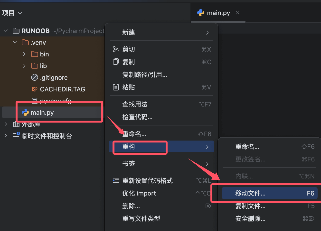 选中文件 → 右键 → 重构(Refactor)→ 移动(Move)