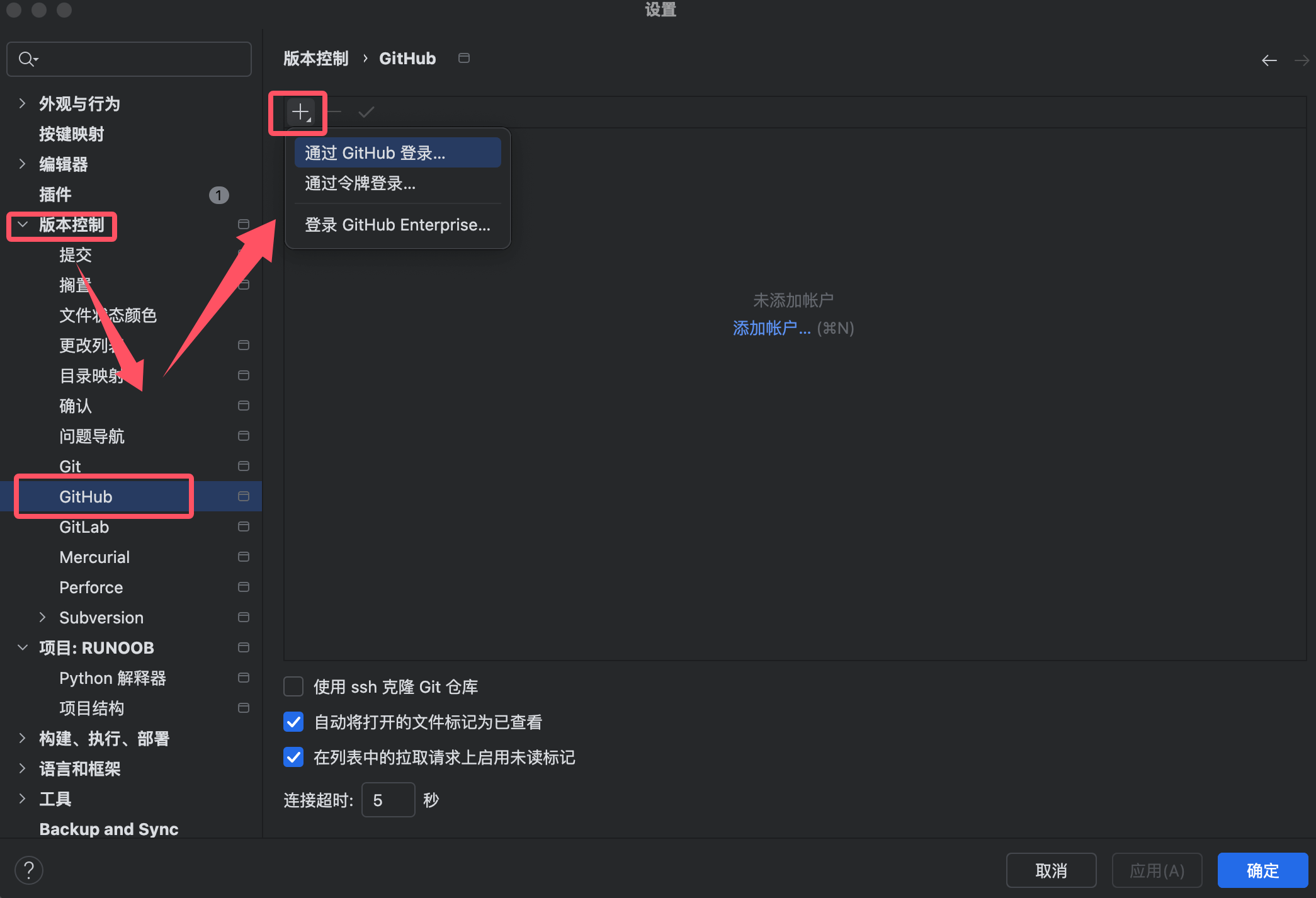 文件/PyCharm → 设置 → 版本控制 → GitHub -