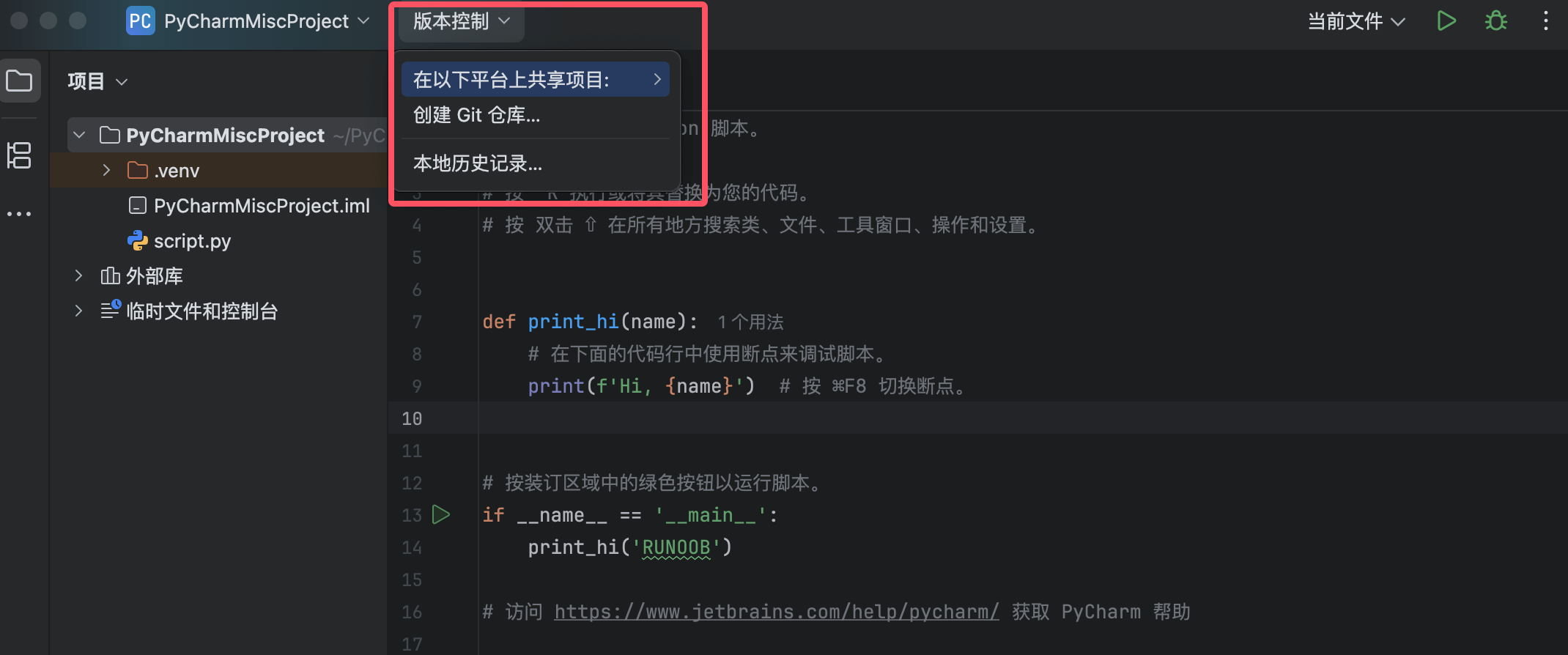 PyCharm 提供了完整的 Git/GitHub 集成功能,让开发者可以直接在 IDE 中完成版本控制操作。