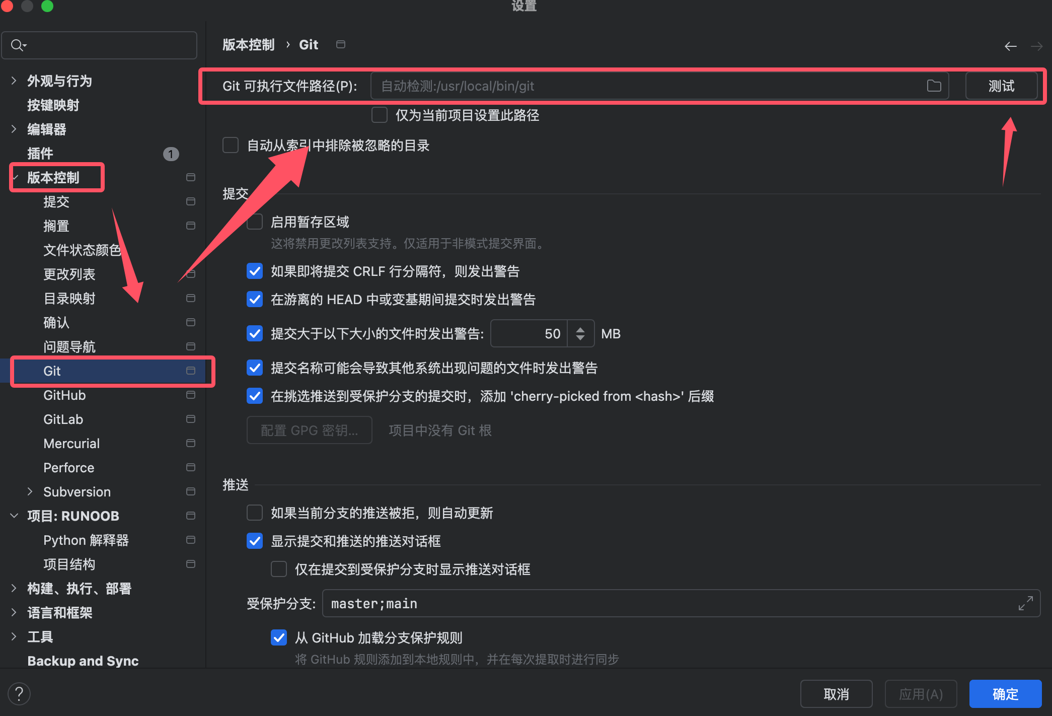 文件/PyCharm → 设置 → 版本控制 → Git -