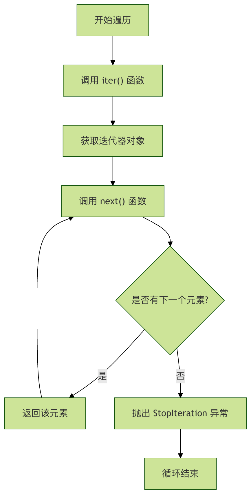 - 可迭代对象 (Iterable):提供创建迭代器的方法