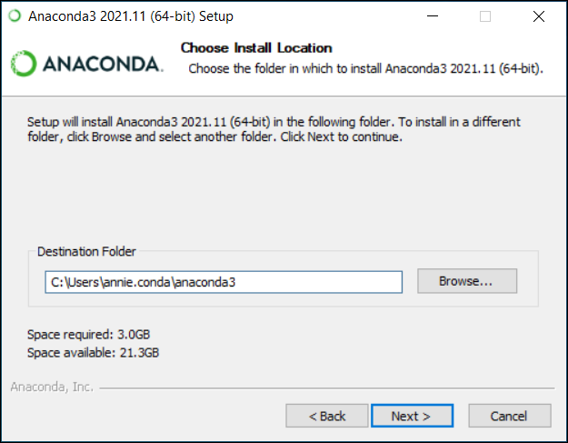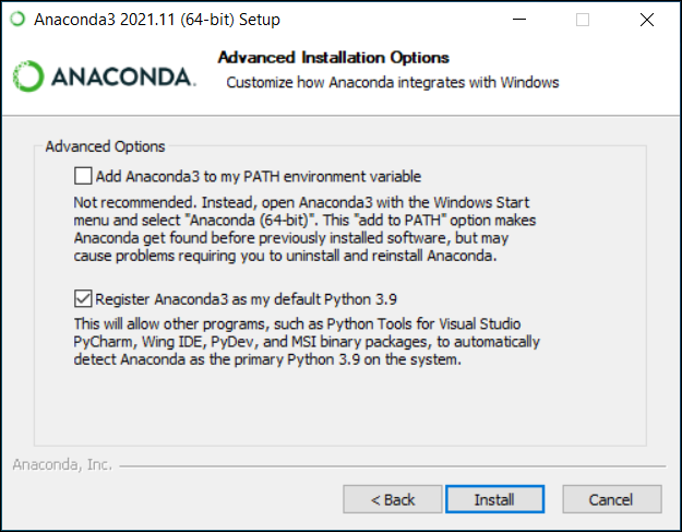 在 "Advanced Installation Options" 中不要勾选 "Add Anaconda to my PATH environment variable."("添加Anaconda至我的环境变量。"),因为如果勾选,则将会影响其他程序的使用。