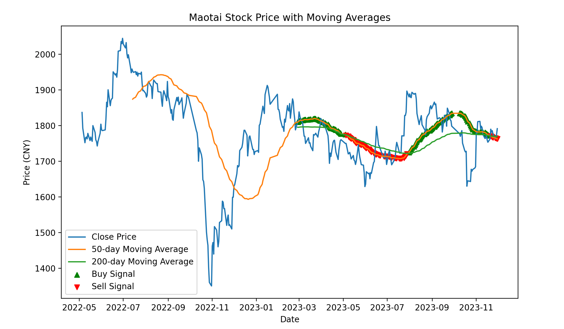 以上实例代码使用贵州茅台(600519.SS)的股票数据,计算了 50 天和 200 天的移动平均线,并通过比较两者的关系生成买卖信号。