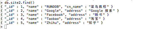 { "_id": 5, "name": "Zhihu", "address": "知乎"}