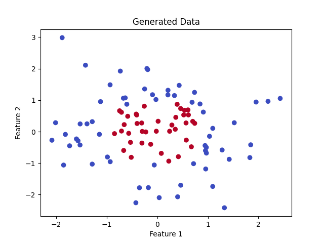 我们假设有一个二维数据集,目标是根据点的位置将它们分类到两个类别中(例如,红色和蓝色点)。