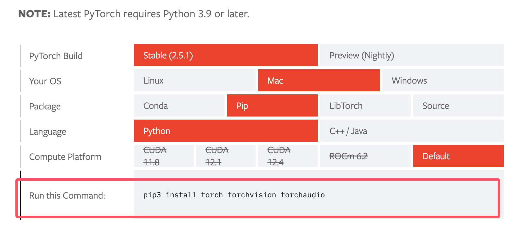 访问 PyTorch 的官方网站 https://pytorch.org/get-started/locally/,网站提供了一个方便的工具,可以根据你的系统配置(操作系统、包管理器、Python版本以及CUDA版本)推荐安装命令。