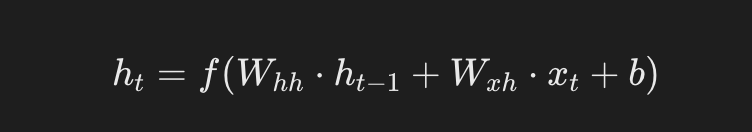 \[ h_t = f(W_{hh}h_{t-1} + W_{xh}x_t + b_h) \]