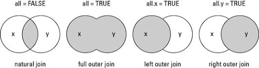 - all:逻辑值; all = L 是 all.x = L 和 all.y = L 的简写,L 可以是 TRUE 或 FALSE。