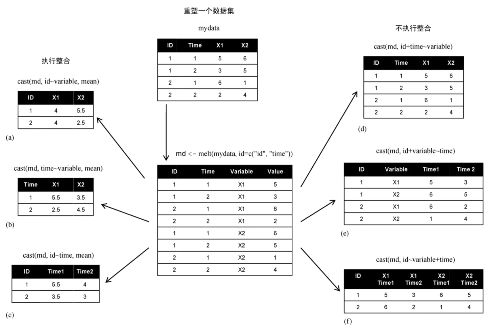 下图很好展示来 melt() 和 cast() 函数的功能(后面实例会详细说明):