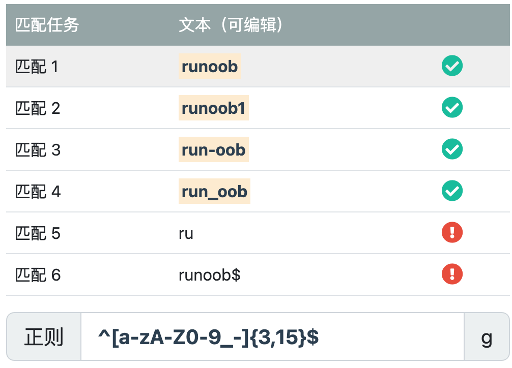 以上的正则表达式可以匹配 runoob、runoob1、run-oob、run_oob, 但不匹配 ru,因为它包含的字母太短了,小于 3 个无法匹配。也不匹配 runoob$, 因为它包含特殊字符。