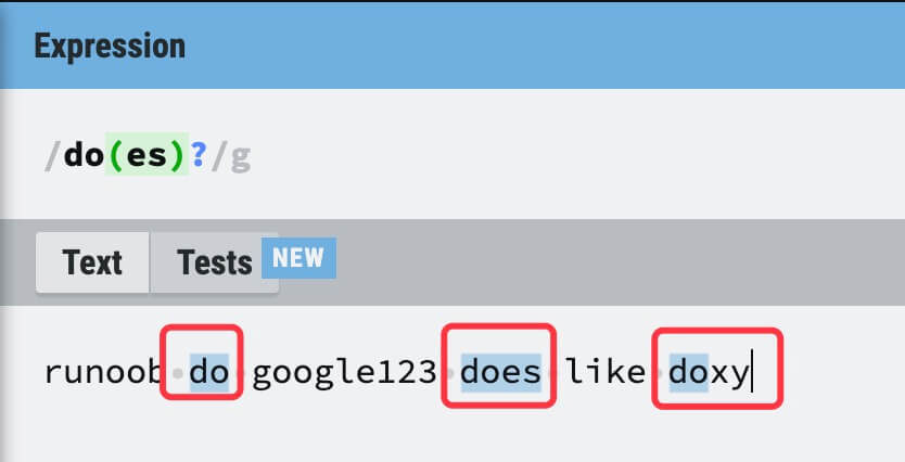 | ? | 匹配前面的子表达式零次或一次。例如,do(es)? 可以匹配 "do" 、 "does"、 "doxy" 中的 "do" 和 "does"。? 等价于 {0,1}。 ![]() |