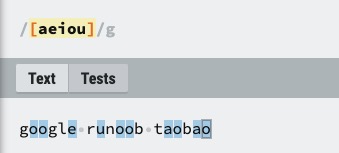 | [ABC] | 匹配 [...] 中的所有字符,例如 [aeiou] 匹配字符串 "google runoob taobao" 中所有的 e o u a 字母。