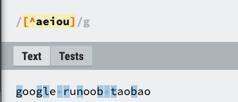 | [^ABC] | 匹配除了 [...] 中字符的所有字符,例如 [^aeiou] 匹配字符串 "google runoob taobao" 中除了 e o u a 字母的所有字符。