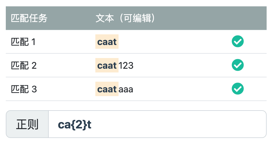 {n}匹配固定数量:使用花括号{n}表示匹配前面的模式恰好 n 次,例如匹配 "caat"、"caat123" 或 "caataaa":/ca{2}t/。尝试一下 »