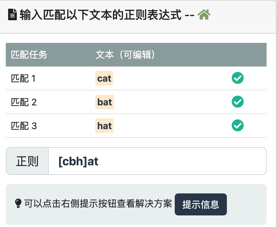 []表示字符集合,匹配集合中的任意字符,例如匹配 "cat"、"bat" 或 "hat":/[cbh]at/。尝试一下 »