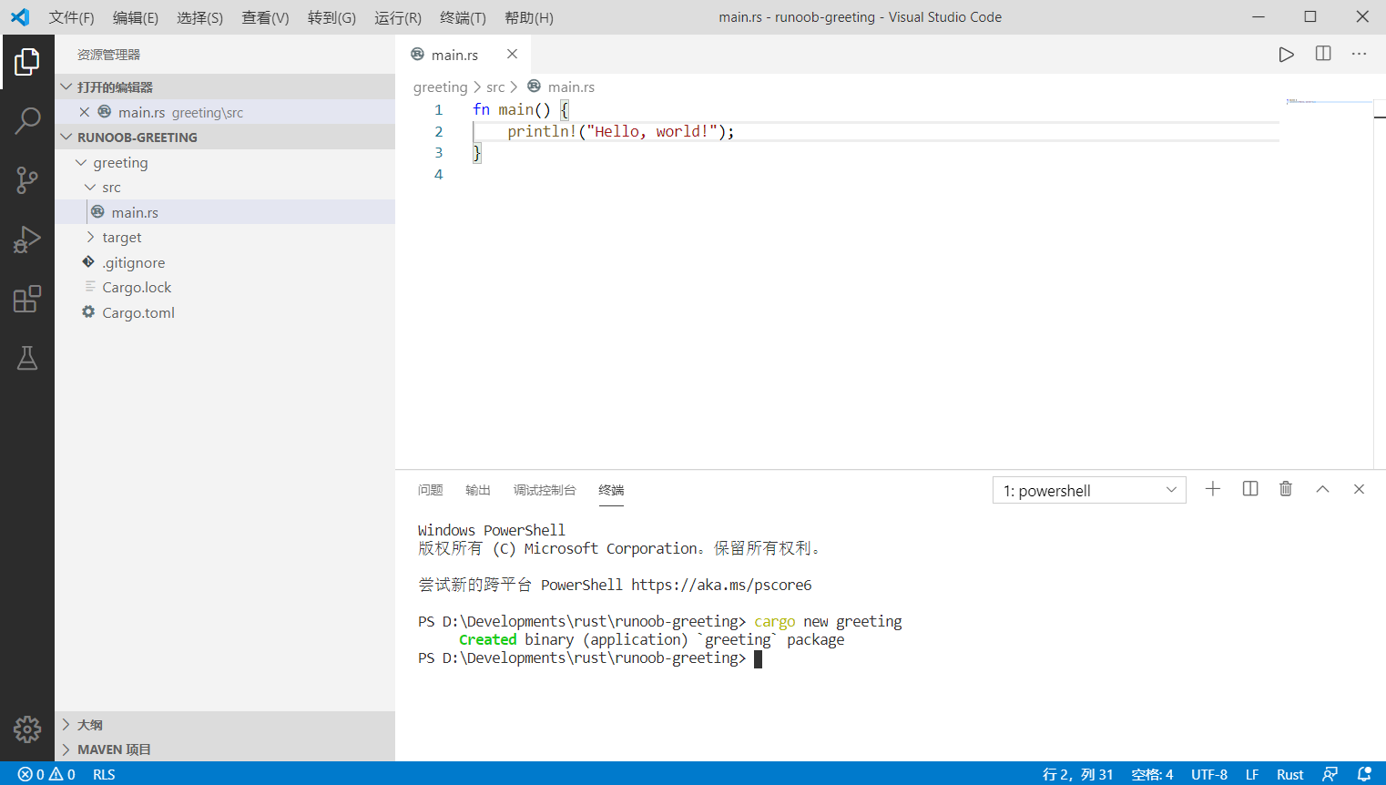 当前文件下下会构建一个名叫 greeting 的 Rust 工程目录。