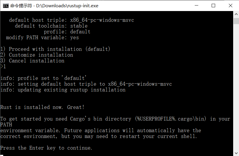 进行到这一步就完成了 Rust 的安装,可以通过以下命令测试: