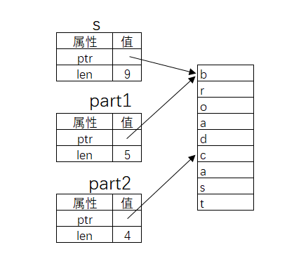 上图解释了字符串切片的原理(注:Rust 中的字符串类型实质上记录了字符在内存中的起始位置和其长度,我们暂时了解到这一点)。