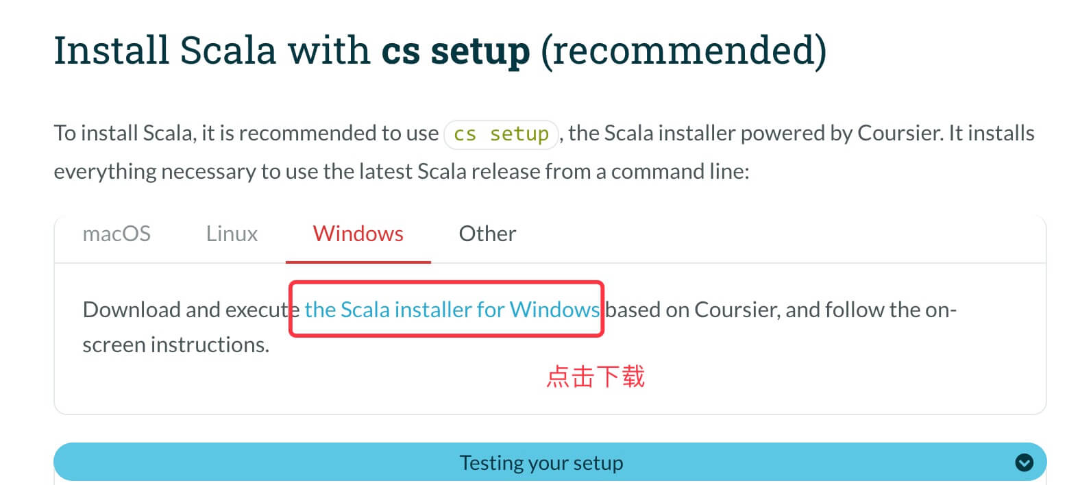 要安装 Scala,建议使用由 Coursier 提供支持的 Scala 安装程序 cs setup